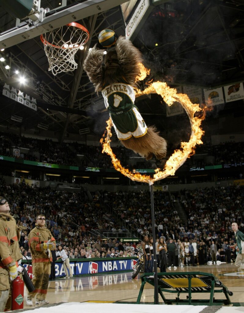 That local love in the Pacific Northwest wasn’t just a result of the players on the court. The Sonics really made an effort to put down roots, connect with the community and reflect the city back to its fans. Enter Squatch. Tapping into the rainy forests that populate Washington state and the lore of the famed and elusive mytho-monster Sasquatch, the Sonics came up with a mascot that instantly felt at home in the Emerald City. Once Squatch came out of hiding and hit the KeyArena, he leveled it up. He was a ferocious, risk-taking dunker who would fly off trampolines or jump off the top of 20-foot-tall ladders just to bring the crowd to its feet. Sadly, when the Sonics new owner moved the team to Oklahoma City, Squatch was retired, and his likeness remains the property of the city of Seattle. So if that expansion ever brings the Sonics back, keep your eyes peeled for Squatch making his way out of the forest.